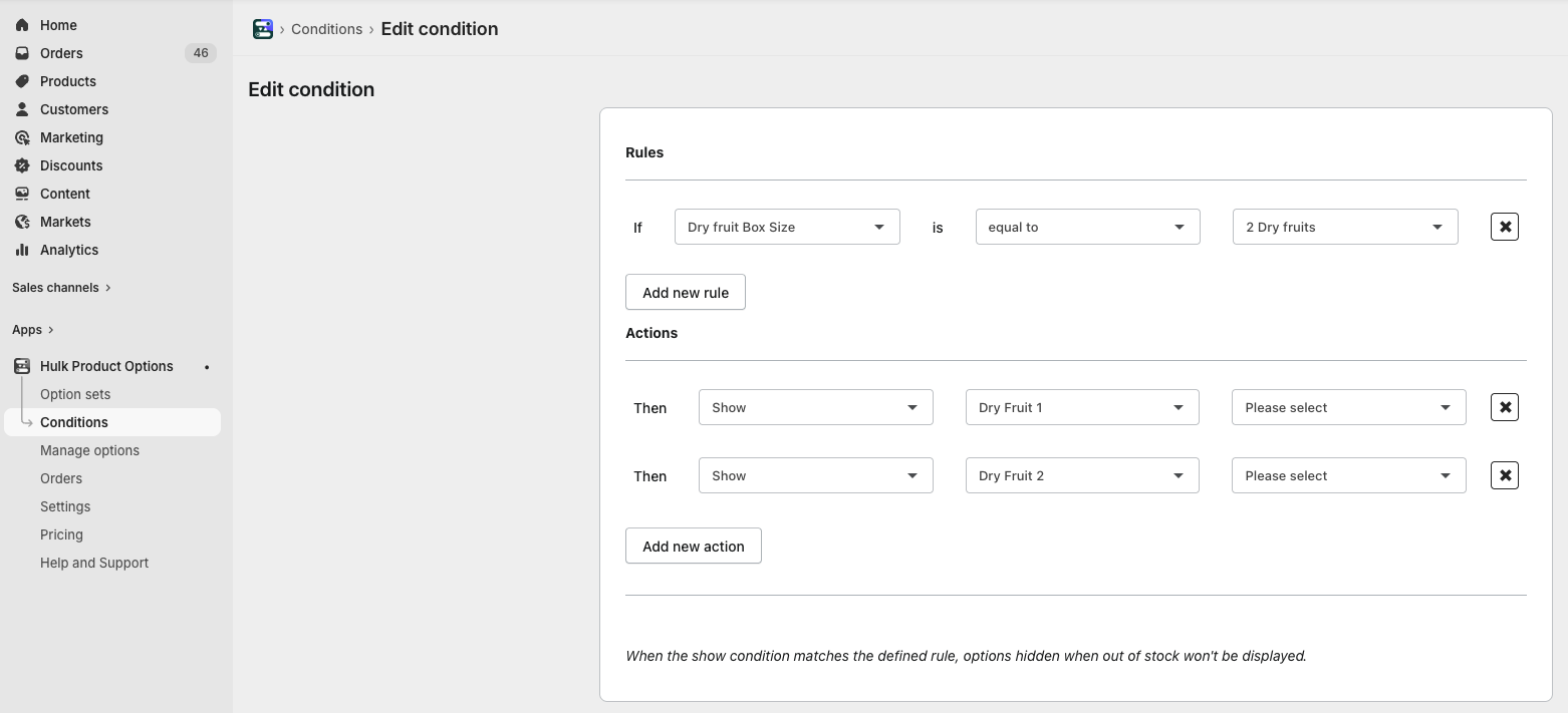 Navigate to the Conditions tab, select the option set for which you need to define conditions, and create a set of Rules and Actions.