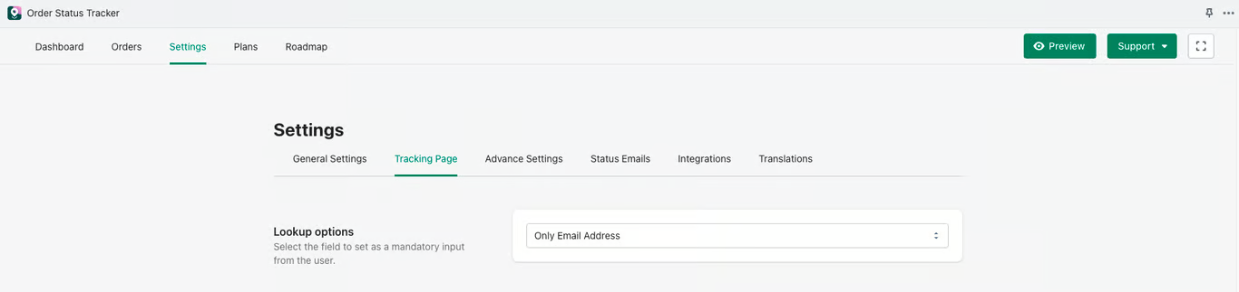 The first option available is to select the Required Input that your customers will be filling in to track their order. Select your desired input from the dropdown menu.