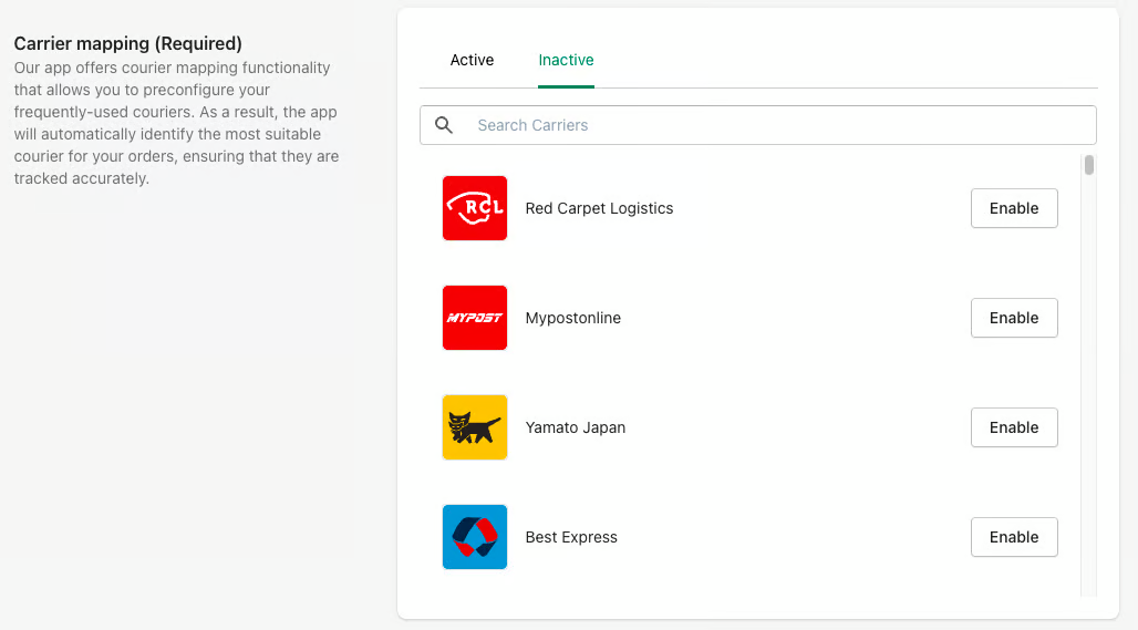 Click on the Carrier provided in the list, or Search Carriers to select the carrier service which you opted to ship your orders.